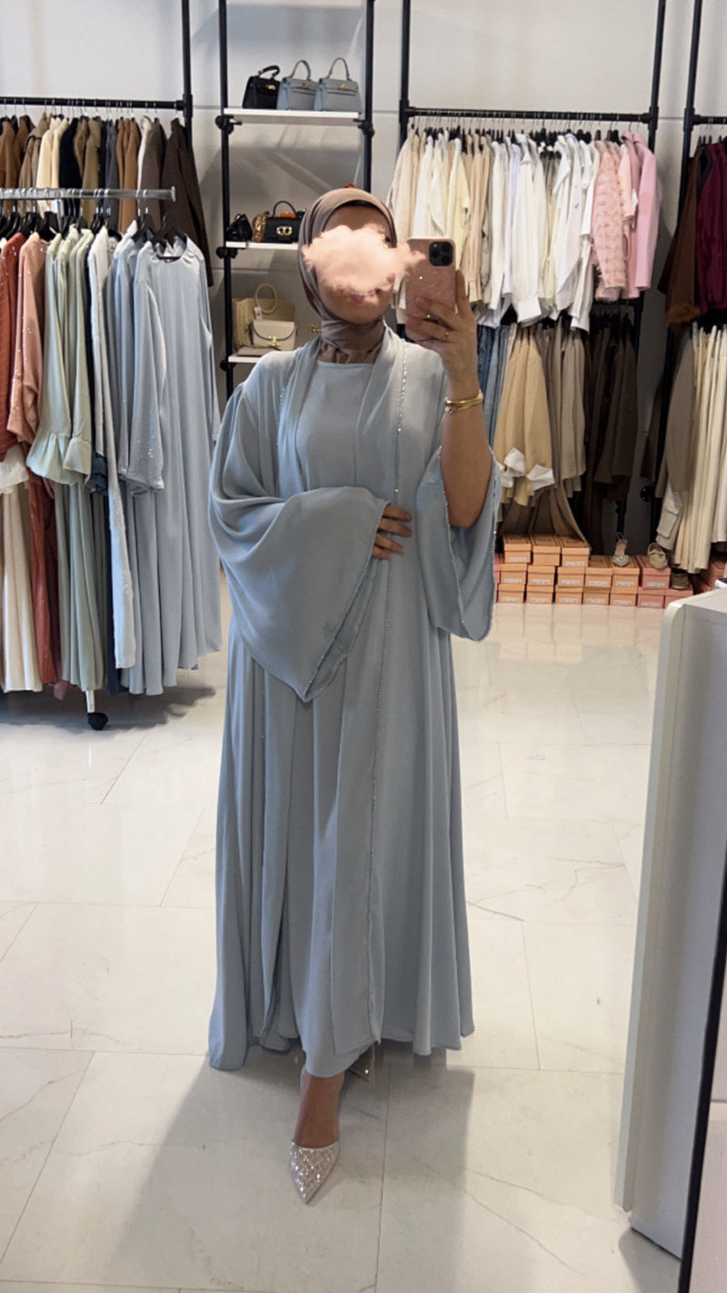 De zachte neutrale kleur en verfijnde afwerking maken deze abaya set een must-have in jouw garderobe. Draag het met hakken voor een klassieke uitstraling of combineer met platte schoenen voor een casual-chique look.